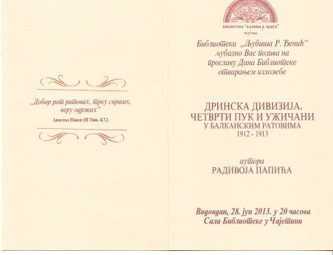 Библиотека ”Љубиша Р. Ђенић” ће у петак 28. јуна 2013. године прославити свој дан и 109 година од оснивања.Том приликом специјално за Дан Библиотеке ће бити приређена изложба ”Дринска дивизија, Четврти пук и Ужичани у Балканским ратовима 1912-1913” аутора Радивоја Папића. Изложбу ће отворити госпођа Станојка Миливојевић, музејски саветник Народног музеја из Ужица, а посетиоци у Чајетини ће моћи да је погледају до 15. јула 2013. године. Током свечаности која ће се одржати поводом Дана Библиотеке биће уручене захвалнице за успешну сарадњу дугогодишњим сарадницима, а музику која ће пратити свечаност изводиће ученици Музичке школе ”Војислав - Лале Стефановић” из Ужица.