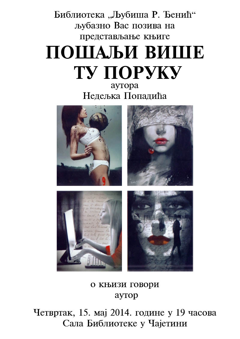 У четвртак, 15. маја 2014. године, са почетком у 19 часова, у Сали Библиотеке, одржаће се представљање књиге "Пошаљи више ту поруку", аутора Недељка Попадића, најпопуларнијег песника за децу и младе у нашој земљи.