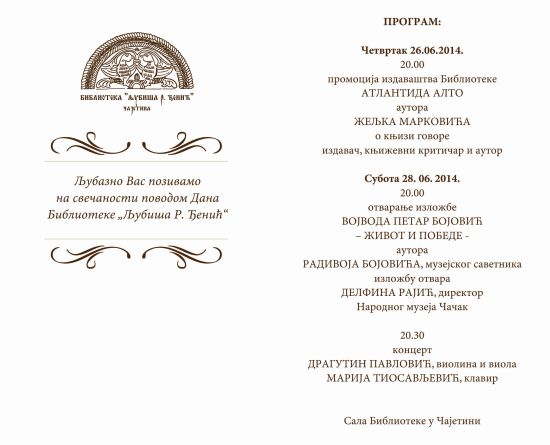 Свечаности поводом обележавања Дана Библиотеке у Чајетини, која ове године прославља 110 година од свог оснивања биће одржане у четвртак, 26. јуна 2014. године и у суботу, 28. јуна 2014. године у Сали Библиотеке.