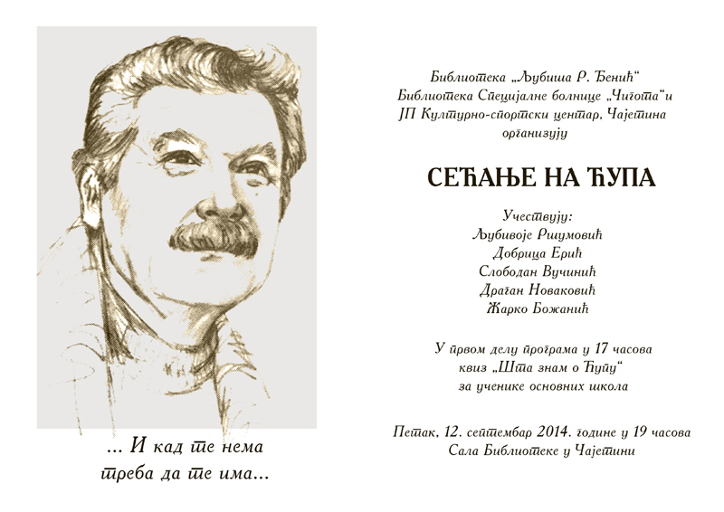 Библиотека "Љубиша Р. Ђенић", Библиотека Специјалне болнице "Чигота" и ЈП Културно - спортски центар Чејетина, у петак 12. септембра 2014. године, у Сали Библиотеке у Чајетини, организују традиционално поетско вече посвећено златиборском завичајном песнику, Михаилу Ћуповићу, под називом Сећање на Ћупа
