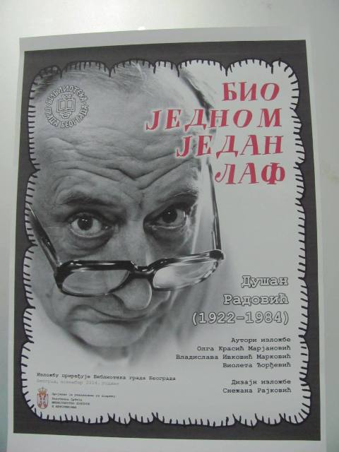 Изложба "Био једном један лаф", ауторки Олге Красић Марјановић, Виолете Ђорђевић и Саре Ивковић Марковић, отворена 3. марта 2016. године у библиотеци "Љубиша Р. Ђенић", на 30 различитих плаката бележи најважније моменте у животу и стваралаштву Душка Радовића: детињство у нишу и Суботици, долазак у Београд и почетак рада у Пионирским новинама, уређивање програма за децу Радио Београда и култна драма Капетан Џон Пиплфокс, уређивање програма на ТВ Београд - серије На слово, на слово и Лаку ноћ, децо, ТВ серија Женски разговори, рад на часопису Полетарац, уређивање на Студију Б... Изложба је отворена до 15. марта 2016. године, у организацији Специјалне библиотеке "Чигота" и библиотеке "Љубиша Р. Ђенић"