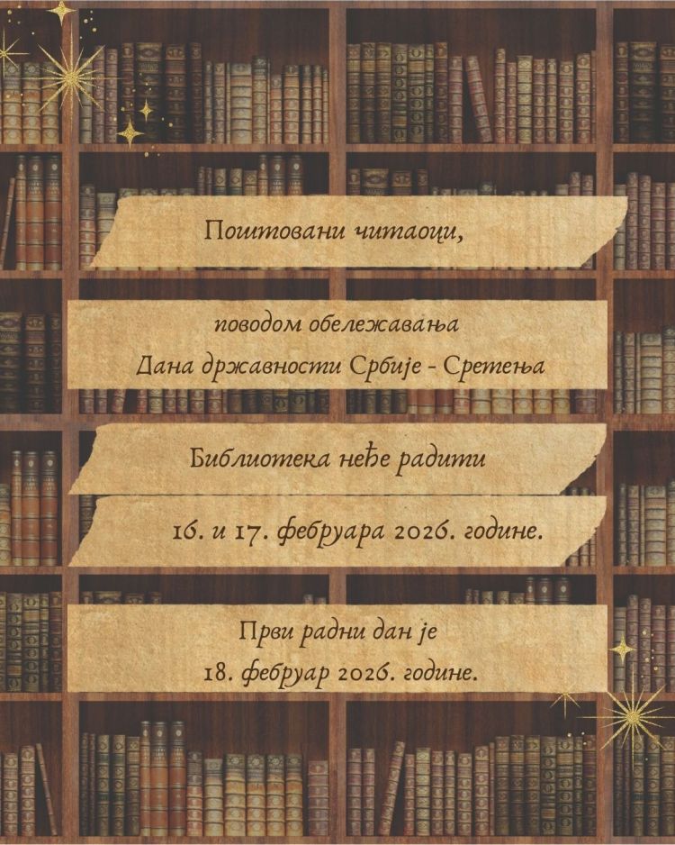 Поводом Дана државности, празника Сретња, Библиотека неће радити 16. и 17. фебруара 2026. године.