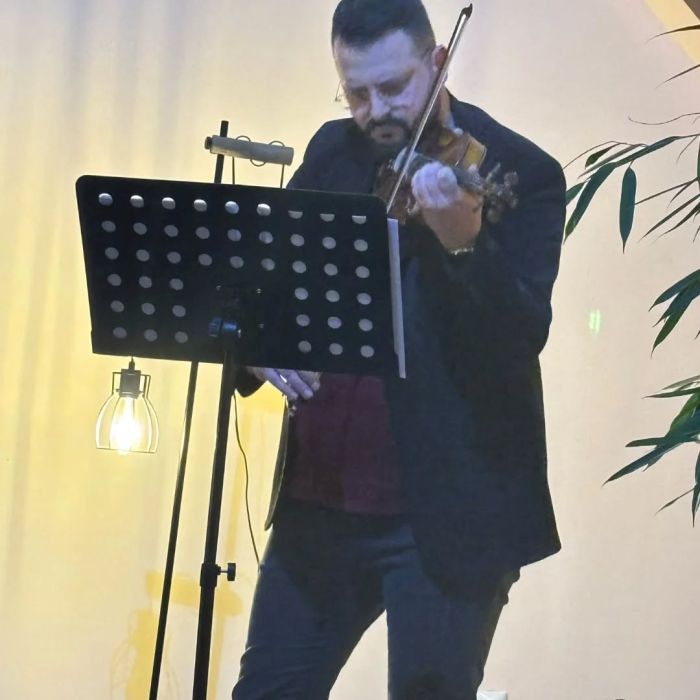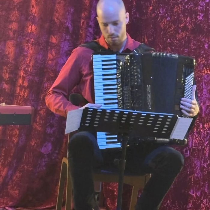 Трио чини следећи састав: Милан Јовић (виолина), Душан Сарић (клавир/клавијатуре) и Стефан Белоица (хармоника). Добро су познати нашој публици, с обзиром да су више пута били наши драги гости. Изводе најпознатије нумере џез, поп, рок, танго, филмске и изворне музике, у акустичној обради и уз дозу импровизације. Тиме је њихов аранжман несвакидашњи, освежавајући и оригиналан.