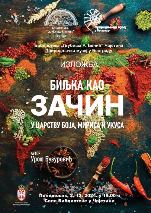 У пoнедељак, 2. децембра 2024. године, у 19.00 часова, у Библиотеци „Љубиша Р. Ђенић” у Чајетини, отвара се гостујућа изложба Природњачког музеја из Београда „Биљка као зачин. У царству бојa, мириса и укуса.” Након великог успеха у Београду, Кикинди и Требињу изложбу ће имати прилику да виде становници и гости Златиборског округа.