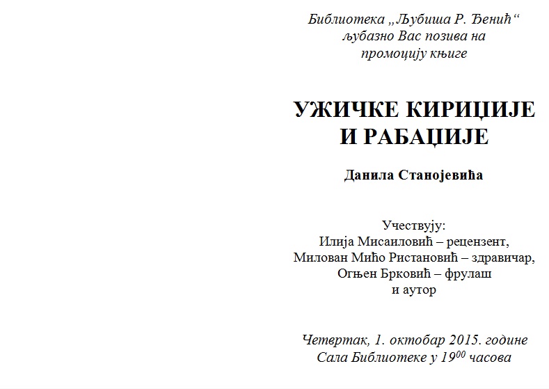 Сала библиотеке "Љубиша Р. Ђенић", у четвртак 26. новембра 2015. године, била је врло посећена. Повод је био представљање књиге "Етнографско стваралаштво Љубише Р. Ђенића Рујанског", аутора Слободана Гавриловића. Са задовољством, Библиотека је подсетила на једно од многих интересовања човека који је имао немерљив допринос за ширење читалачке културе овог краја, а чије име Библиотека данас носи. Поред аутора, о значају етнографског стваралаштва Љубише Р. Ђенића говорила је и Боса Росић, етнолог.