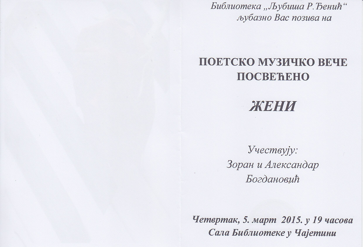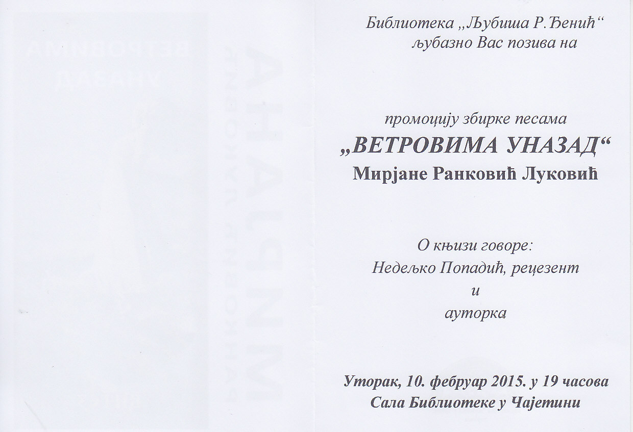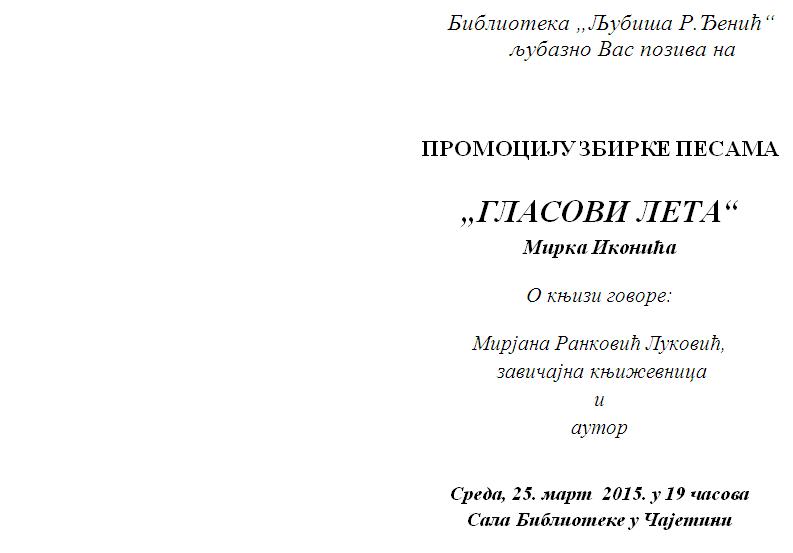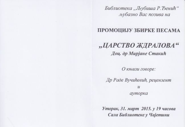 У уторак, 31. марта 2015. са почетком у 19.00 часова, у Сали Библиотеке одржаће се промоција збирке песама "Царство ждралова" доц. др Мирјане Стакић.
