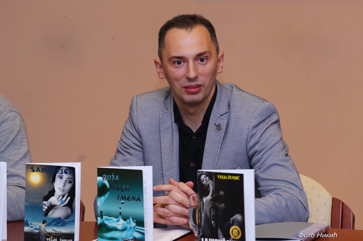 Веља Жуњић, књижевник из Лајковца, најпре је поздравио публику и испричао неколико анегдота о свом књижевном стваралаштву и уопште идеји о писању. Сваке године, практикује да својим пријатељима улепша Новогодишње празнике и поклони им нешто необично. Пре пар година, дошао је на идеју да пријатељима поклони роман. У тајности пише неколико месеци, а затим, први пут на читање списе даје својој супризи, коју помно посматра док чита. Како сам аутор каже, њене сузе и смех, као и све остале реакције, биле су му јасан знак да је створио ваљан поклон својим пријатељима, али ни након те спознаје и даље нема амбицију да поменуте списе да у јавност. Међутим, сплет околности ипак ствара ситуацију у којој Веља постаје добар аутор неколико романа, али и позоришних представа...